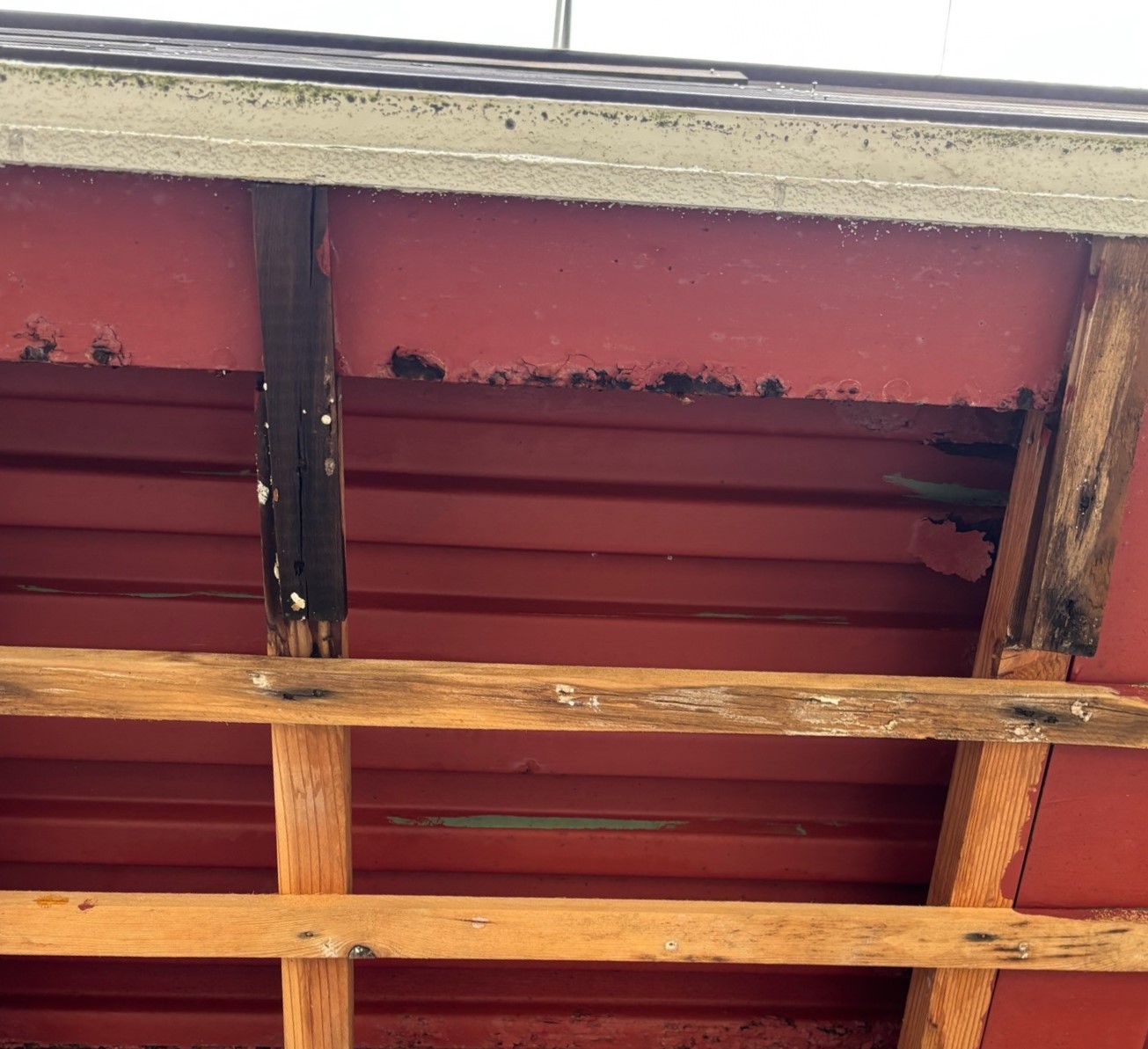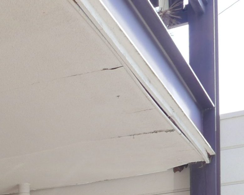 雨漏りによってケイカル板に反りが発生し、浮いてしまっている状態です。
