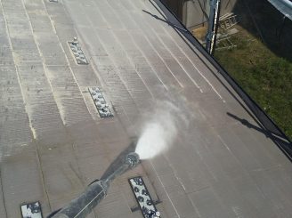 高圧洗浄:外壁だけでなく屋根も、汚れや古い塗膜を取り除くために高圧洗浄機で洗い落としていきます。
