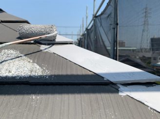 上塗り:「超低汚染リファイン500MF-IR」屋根用塗料を使用しました。汚れが付着しにくく、紫外線からの劣化の進行と、遮熱性を持ち合わせた塗料です。