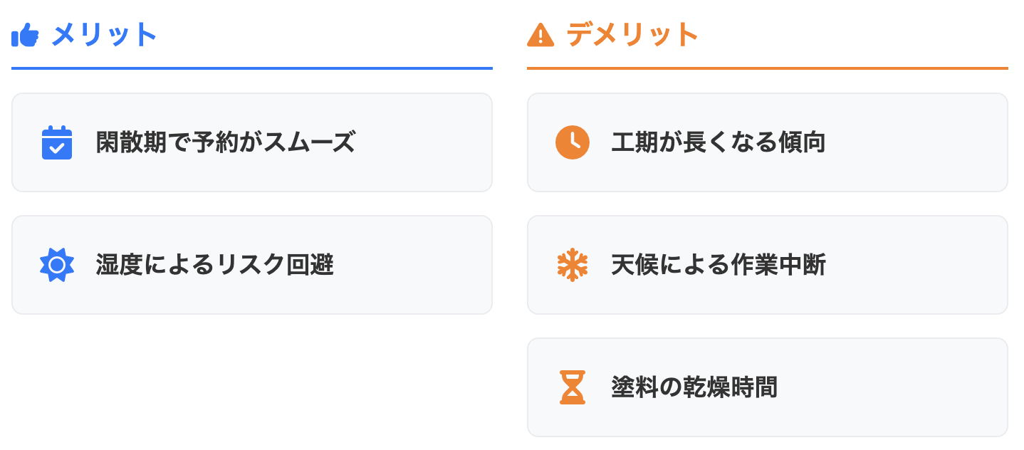 比較的予約が取りやすく、職人や資材の手配がスムーズになりやすいというスケジュール面での利点があります。また、先述の通り、雨が少なく低湿度な日が多いため、湿度による塗膜の白化リスクを回避しやすいという品質面での利点も挙げられます。