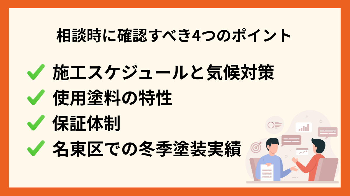 誤った業者選びや、時期・気候を無視した工事のリスクを避けるために、塗装会社に相談する際に必ず確認すべき4つのポイントをご紹介します。