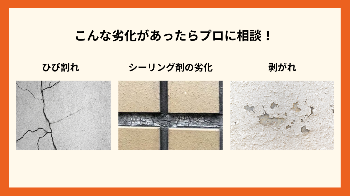 ご自身で掃除を行なっても落ちないほどの汚れや、塗膜の剥がれ、外壁材のひび割れ、シーリング材の劣化が見られる場合は、早期にプロの塗装会社へ相談すべきサインです。