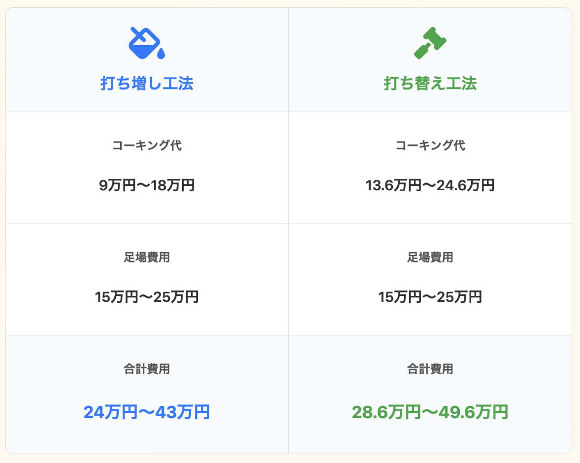 工法によって費用も役割も異なるため、見積書を見る際は「どの部位が打ち替えで、どの部位が増し打ちなのか」が明確に記載されているかを必ず確認することをおすすめします。