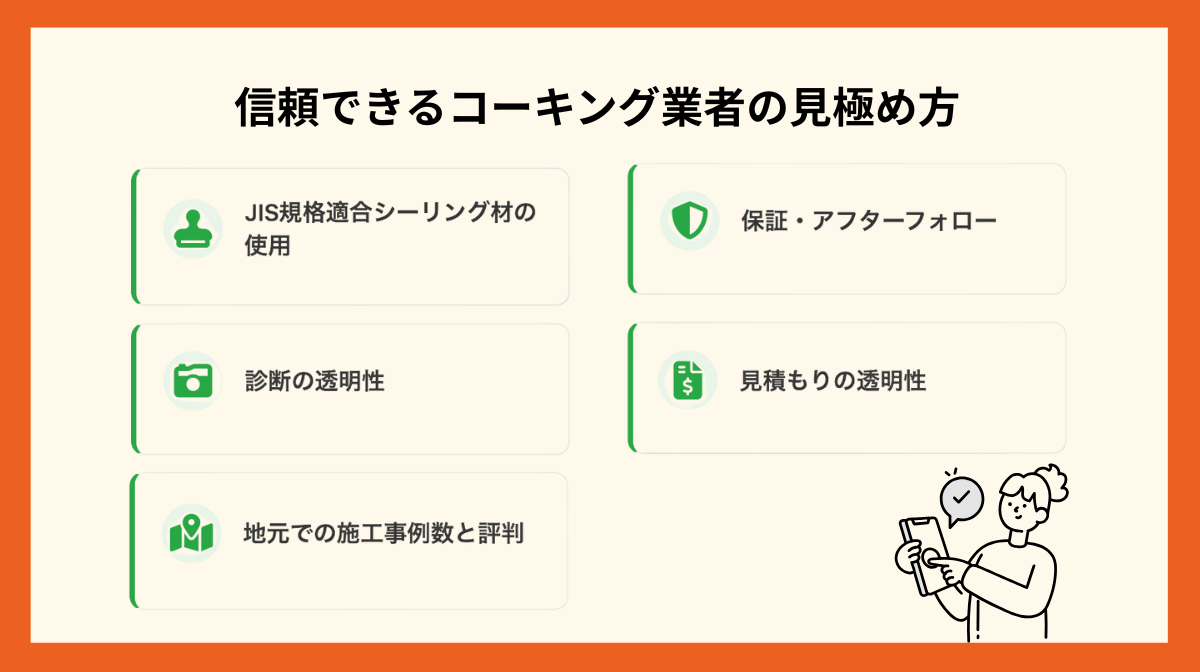 - 見積もりの透明性コーキングの工法(打ち増し/打ち替え)や塗料のグレードが詳細に記載されているか。