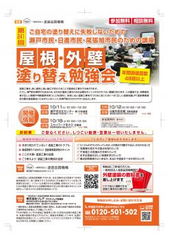 ホーム イベント情報一覧 屋根・外壁の塗り替えセミナー(尾張旭市) イベント開催情報 EVENT ※営業行為は一切行ないませんので安心してご参加ください。 開催日 2025/10/18(土) 時間 10:00~12:00 ※受付開始9:50 会場 スカイワードあさひ 会議室 地図 イベント内容 屋根・外壁の塗り替えセミナー イベントチラシ ご予約フォーム お名前必須 フリガナ 住所 〒 都道府県 ---北海道青森県岩手県宮城県秋田県山形県福島県茨城県栃木県群馬県埼玉県千葉県東京都神奈川県新潟県富山県石川県福井県山梨県長野県岐阜県静岡県愛知県三重県滋賀県京都府大阪府兵庫県奈良県和歌山県鳥取県島根県岡山県広島県山口県徳島県香川県愛媛県高知県福岡県佐賀県長崎県熊本県大分県宮崎県鹿児島県沖縄県 市区町村 丁目番地 電話番号必須 メールアドレス必須 プライバシーポリシーはこちら [ピックアップ] ドローン診断 屋根の修理・雨漏り診断 重要な屋根・外壁塗装の色選び プロタイムズテレビCM お家の健康診断 外壁塗装のトラブルがなくならない理由 見積書の見方 ボランティア塗装 LINE公式アカウント