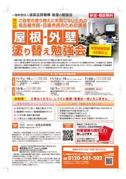 ホーム イベント情報一覧 屋根・外壁の塗り替えセミナー(北区11/15) イベント開催情報 EVENT ※営業行為は一切行ないませんので安心してご参加ください。 開催日 2025/11/15(土) 時間 10:00~12:00 ※受付開始9:50 会場 北生涯学習センター 第6集会室 地図 イベント内容 ・あまり知られていない!塗装工事のトラブル ・信頼できる!塗装会社の選び方 ・ここが大事!塗装工事の品質 ・こう考えよう!塗装工事の費用の目安 イベントチラシ ご予約フォーム お名前必須 フリガナ 住所 〒 都道府県 ---北海道青森県岩手県宮城県秋田県山形県福島県茨城県栃木県群馬県埼玉県千葉県東京都神奈川県新潟県富山県石川県福井県山梨県長野県岐阜県静岡県愛知県三重県滋賀県京都府大阪府兵庫県奈良県和歌山県鳥取県島根県岡山県広島県山口県徳島県香川県愛媛県高知県福岡県佐賀県長崎県熊本県大分県宮崎県鹿児島県沖縄県 市区町村 丁目番地 電話番号必須 メールアドレス必須 プライバシーポリシーはこちら [ピックアップ] ドローン診断 屋根の修理・雨漏り診断 重要な屋根・外壁塗装の色選び プロタイムズテレビCM お家の健康診断 外壁塗装のトラブルがなくならない理由 見積書の見方 ボランティア塗装 LINE公式アカウント