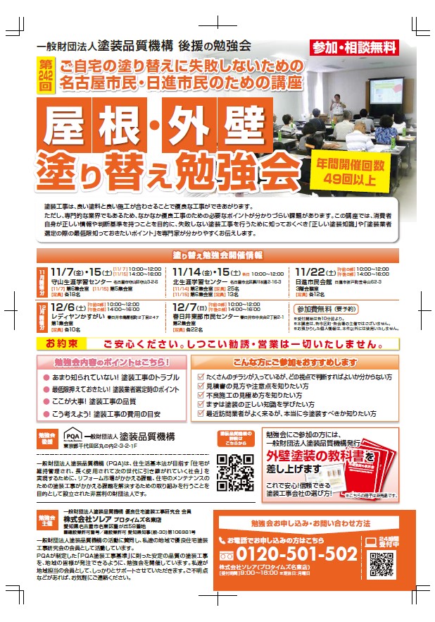 ホーム イベント情報一覧 屋根・外壁の塗り替えセミナー(春日井市12/6PM) イベント開催情報 EVENT ※営業行為は一切行ないませんので安心してご参加ください。 開催日 2025/12/06(土) 時間 14:00~16:00 ※受付開始13:50 会場 レディヤンかすがい 第1集会室 地図 イベント内容 ・あまり知られていない!塗装工事のトラブル ・信頼できる!塗装会社の選び方 ・ここが大事!塗装工事の品質 ・こう考えよう!塗装工事の費用の目安 イベントチラシ ご予約フォーム お名前必須 フリガナ 住所 〒 都道府県 ---北海道青森県岩手県宮城県秋田県山形県福島県茨城県栃木県群馬県埼玉県千葉県東京都神奈川県新潟県富山県石川県福井県山梨県長野県岐阜県静岡県愛知県三重県滋賀県京都府大阪府兵庫県奈良県和歌山県鳥取県島根県岡山県広島県山口県徳島県香川県愛媛県高知県福岡県佐賀県長崎県熊本県大分県宮崎県鹿児島県沖縄県 市区町村 丁目番地 電話番号必須 メールアドレス必須 プライバシーポリシーはこちら [ピックアップ] ドローン診断 屋根の修理・雨漏り診断 重要な屋根・外壁塗装の色選び プロタイムズテレビCM お家の健康診断 外壁塗装のトラブルがなくならない理由 見積書の見方 ボランティア塗装 LINE公式アカウント