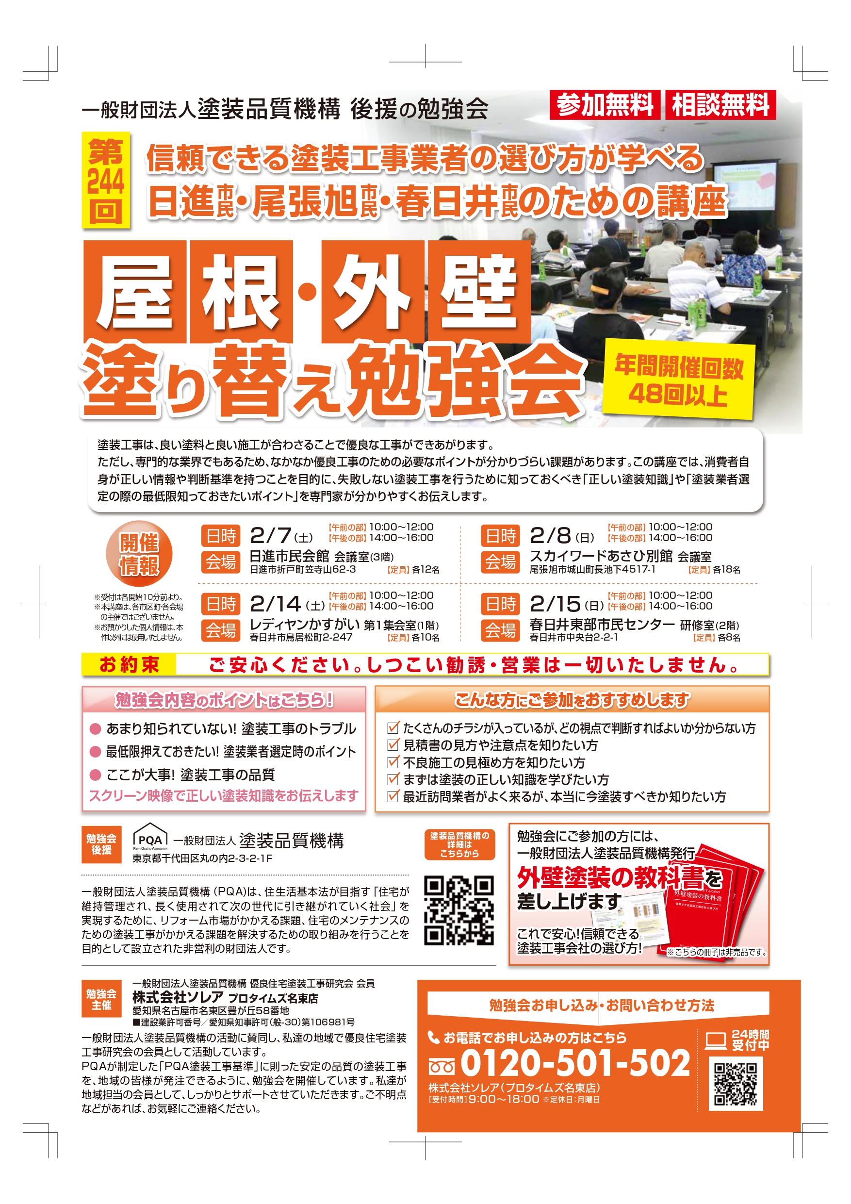 ホーム イベント情報一覧 屋根・外壁の塗り替え勉強会(2/15PM春日井市) イベント開催情報 EVENT ※営業行為は一切行ないませんので安心してご参加ください。 開催日 2026/02/15(日) 時間 14:00~16:00 ※受付開始13:50 会場 春日井東部市民センター 研修室 地図 イベント内容 ・あまり知られていない!塗装工事のトラブル ・信頼できる!塗装会社の選び方 ・ここが大事!塗装工事の品質 ・こう考えよう!塗装工事の費用の目安 イベントチラシ ご予約フォーム お名前必須 フリガナ 住所 〒 都道府県 ---北海道青森県岩手県宮城県秋田県山形県福島県茨城県栃木県群馬県埼玉県千葉県東京都神奈川県新潟県富山県石川県福井県山梨県長野県岐阜県静岡県愛知県三重県滋賀県京都府大阪府兵庫県奈良県和歌山県鳥取県島根県岡山県広島県山口県徳島県香川県愛媛県高知県福岡県佐賀県長崎県熊本県大分県宮崎県鹿児島県沖縄県 市区町村 丁目番地 電話番号必須 メールアドレス必須 プライバシーポリシーはこちら [ピックアップ] ドローン診断 屋根の修理・雨漏り診断 重要な屋根・外壁塗装の色選び プロタイムズテレビCM お家の健康診断 外壁塗装のトラブルがなくならない理由 見積書の見方 ボランティア塗装 LINE公式アカウント